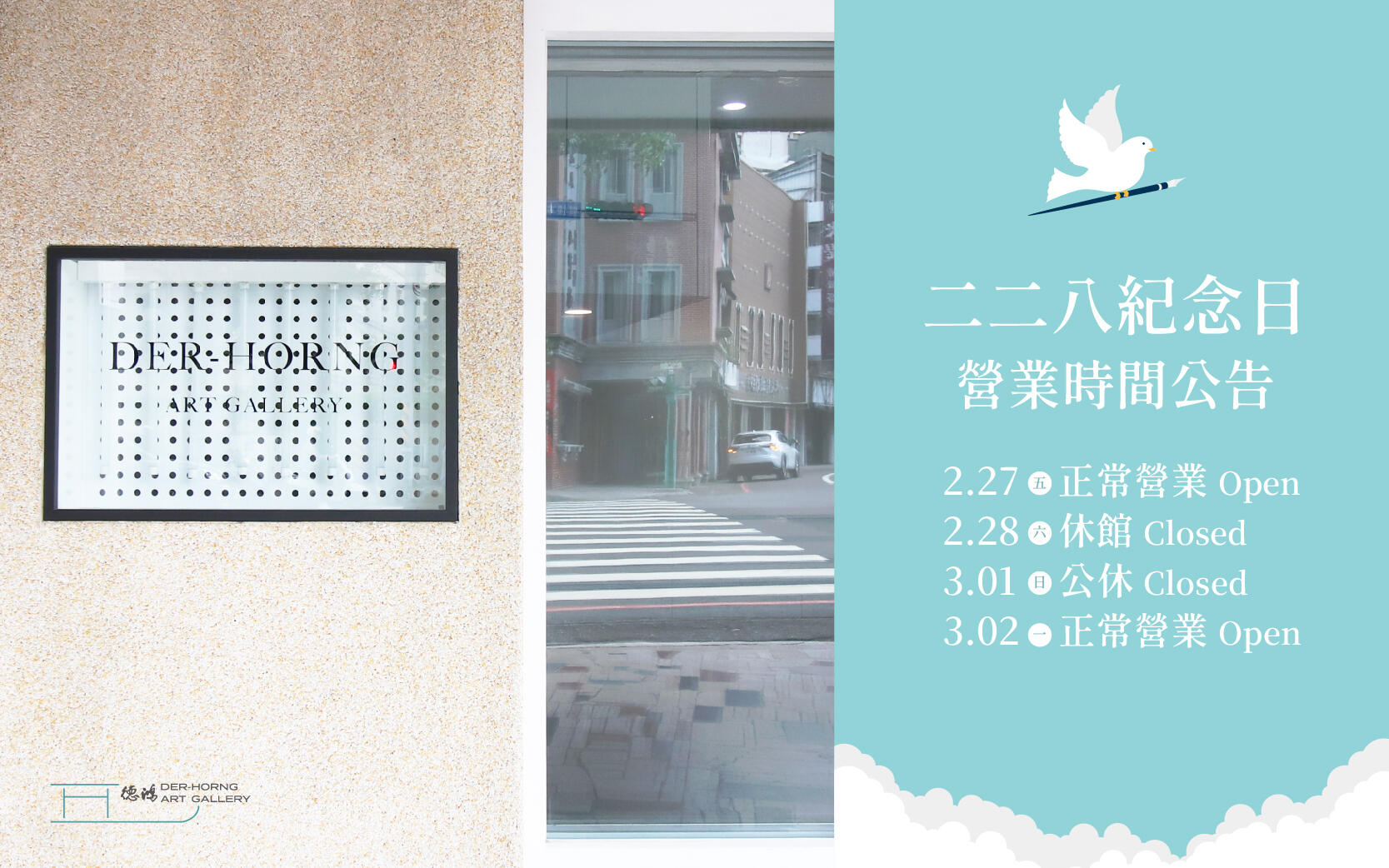 本畫廊的營業時間如下:2 / 27 (Fri.)— 正常營業 Open2 / 28 (Sat.)— 休館 Closed3 / 1 (Sun.)— 公休 Closed3 / 2 (Mon.)— 正常營業 Open